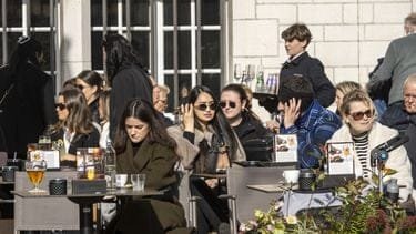 Nederland, Amsterdam, 23-2-2025. Cafe met terras op de dam in het centrum. Zonnige dag in de winter. Copyright: ANP / Hollandse Hoogte / Sabine Joosten